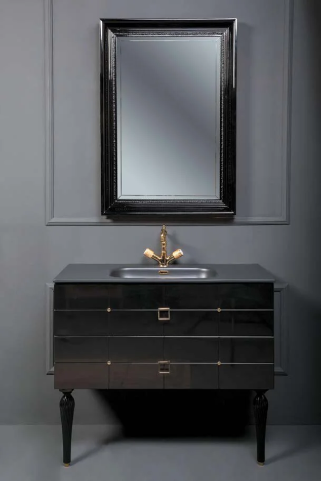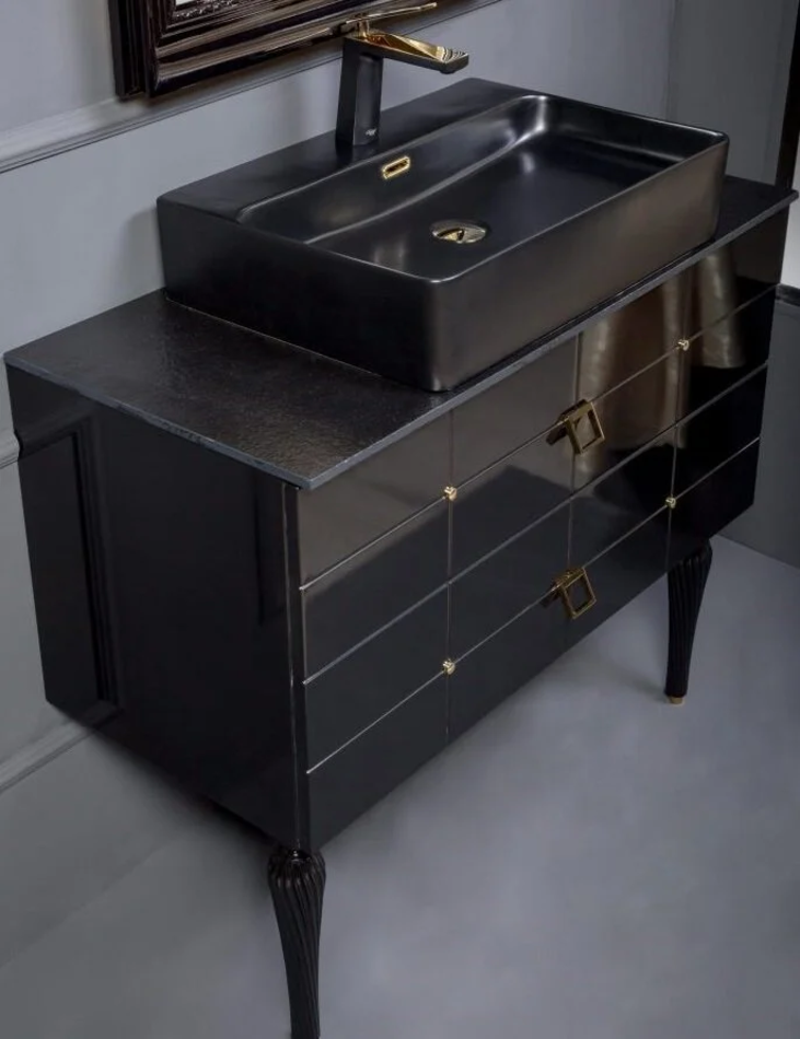 Тумба под раковину Размер: 80 x 46 x 38 см Монтаж: подвесной Ящики выдвижные: 2 Система плавного закрывания Материал: МДФ Форма: прямоугольная Цвет: черный, золото