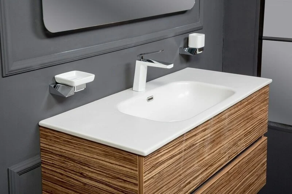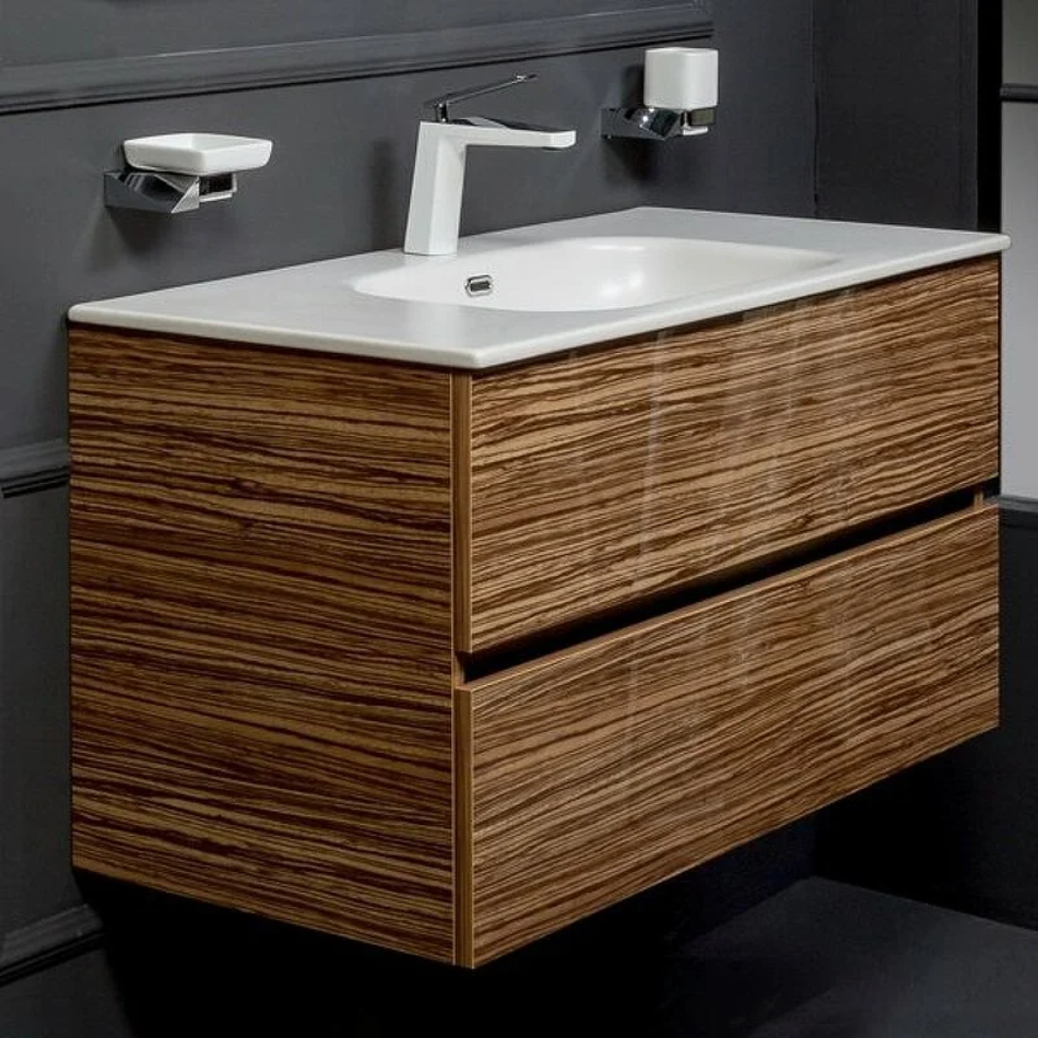 Тумба под раковину Размер: 100 x 46 x 53 см Монтаж: подвесной Ящики выдвижные: 2 Система плавного закрывания Форма: прямоугольная Материал: МДФ Цвет: зебрано