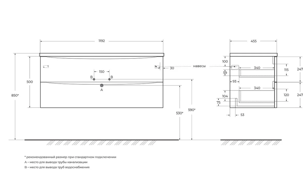 Система хранения: 2 выдвижных ящика, оснащена доводчиками скрытого монтажа с системой Soft close (плавного закрывания) с врезными (фрезерованными) ручками в плоскости фасада.