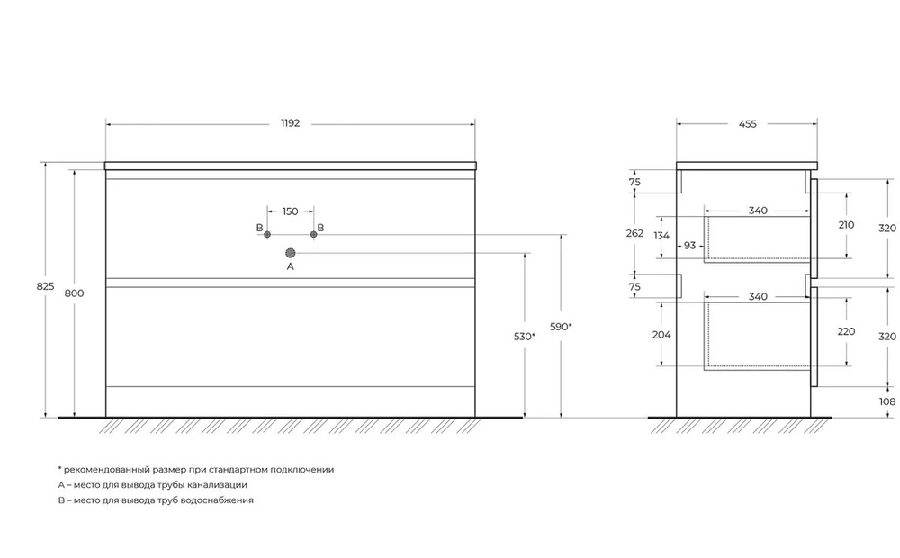 Тумба напольная с возможностью комплектации раковиной из искусственного мрамора. Два выдвижных ящика с фрезерованными ручками в плоскости фасада. Ящики оснащены доводчиками скрытого монтажа с системой soft close (плавного закрывания). Раковина приобретается отдельно.