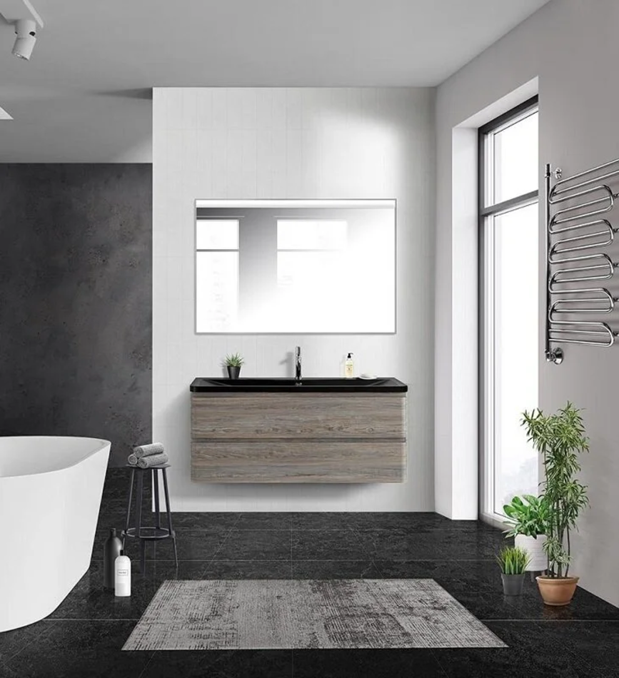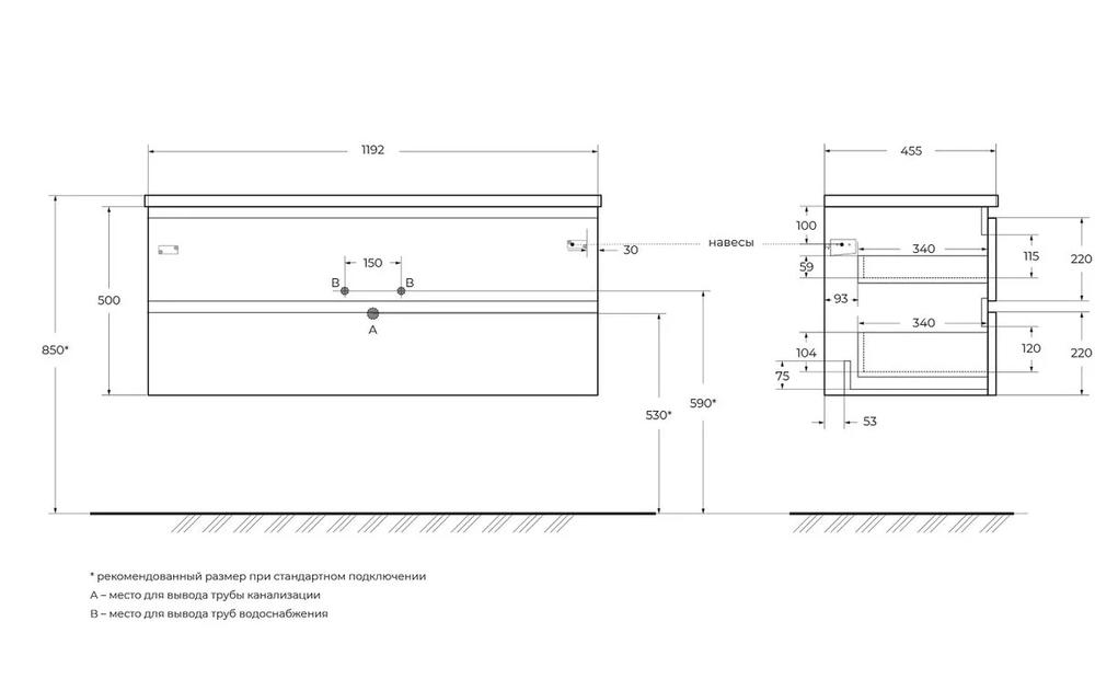 Тумба подвесная с возможностью комплектации раковиной из искусственного мрамора. Два выдвижных ящика с фрезерованными ручками в плоскости фасада. Ящики оснащены доводчиками скрытого монтажа с системой soft close (плавного закрывания). Раковина приобретается отдельно.