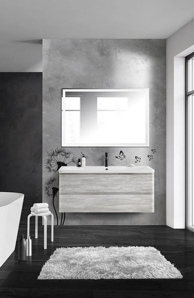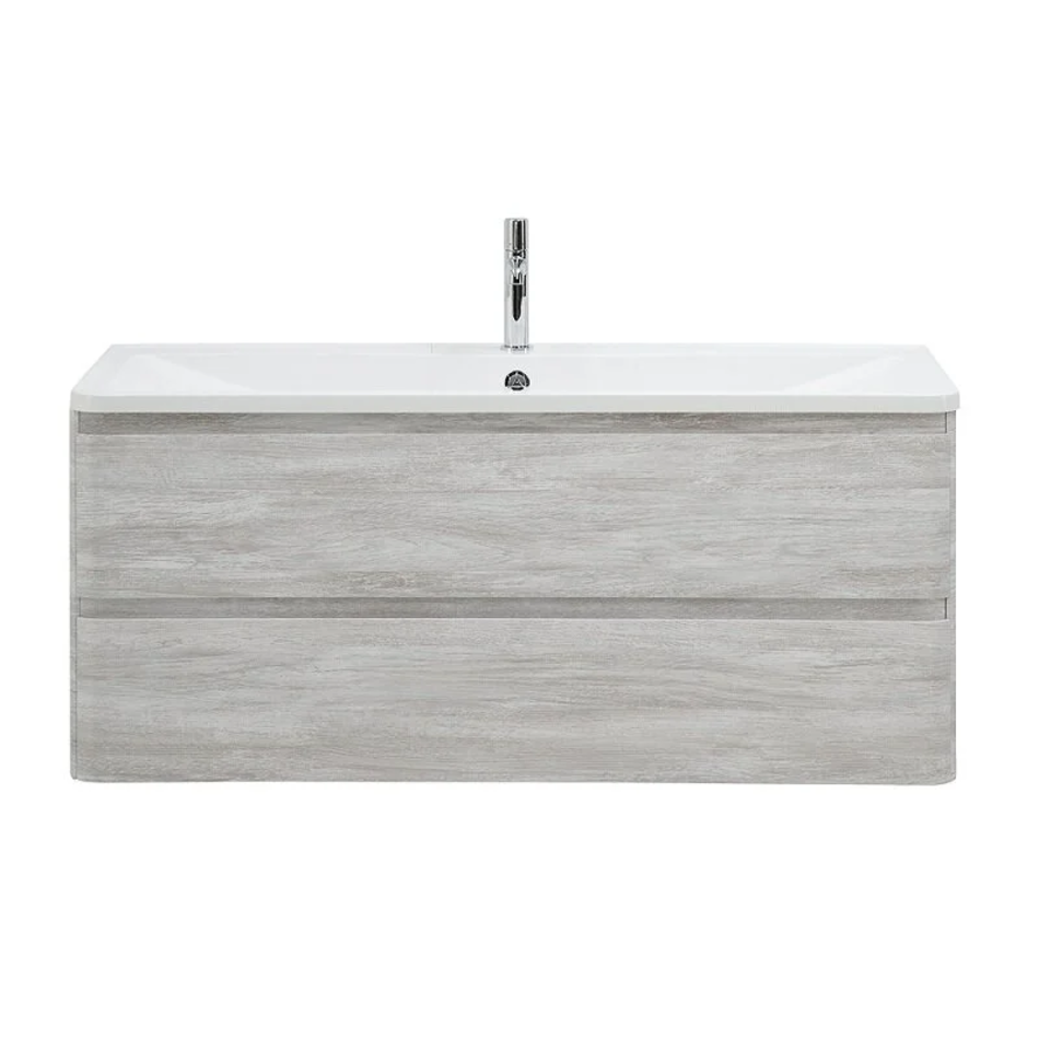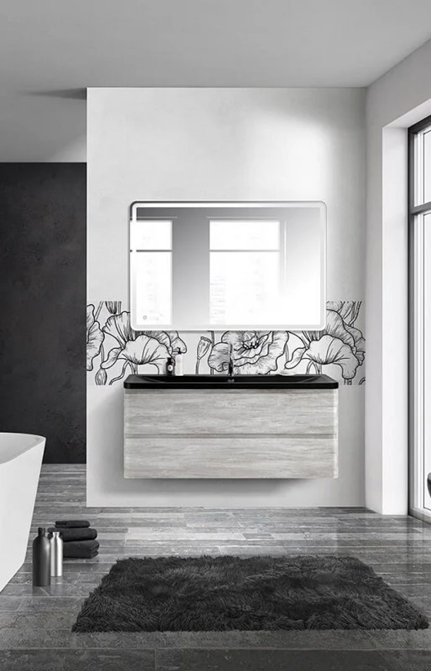 Тумба подвесная с возможностью комплектации раковиной из искусственного мрамора. Два выдвижных ящика с фрезерованными ручками в плоскости фасада. Ящики оснащены доводчиками скрытого монтажа с системой soft close (плавного закрывания). Раковина приобретается отдельно.