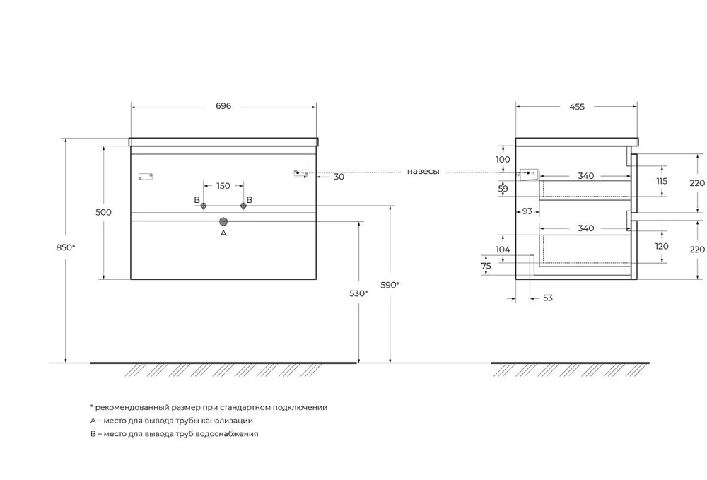 Тумба подвесная с двумя выкатными ящиками для дополнительной комплектации раковиной. Два выдвижных ящика с фрезерованными ручками в плоскости фасада. Ящики оснащены доводчиками скрытого монтажа с системой soft close (плавного закрывания).