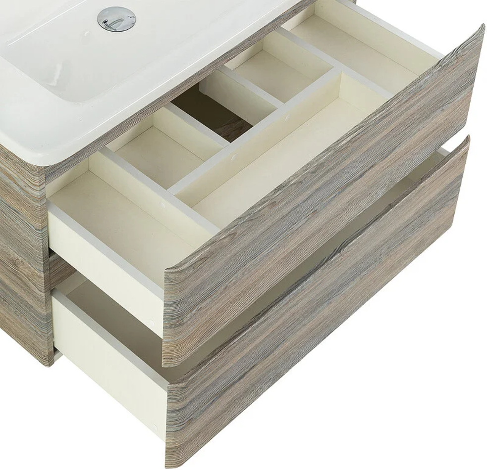 Тумба подвесная с двумя выкатными ящиками. Два выдвижных ящика с фрезерованными ручками в плоскости фасада. Ящики оснащены доводчиками скрытого монтажа с системой soft close (плавного закрывания).