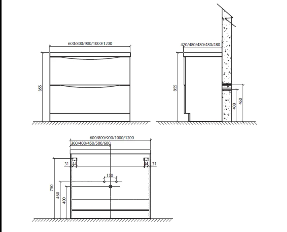 База под раковину напольная с двумя выкатными ящиками, с доводчиками, 1200x480x800 мм