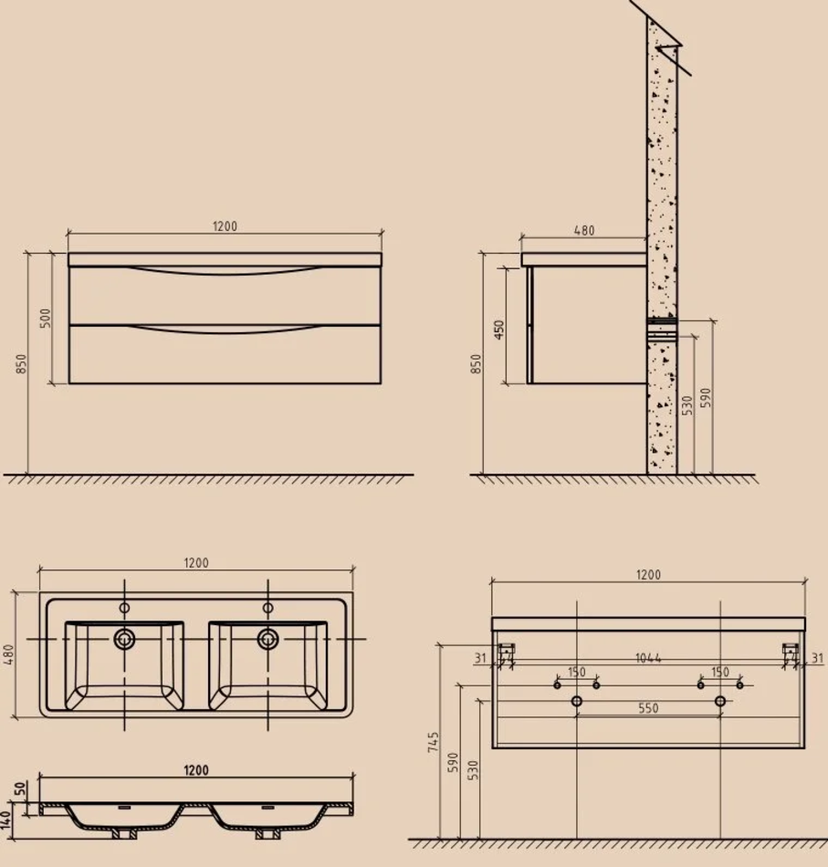 Тумба под раковину Belbagno Ancona-N-1200-2C-SO-2-RW, 120 см, подвесная, коричневый
