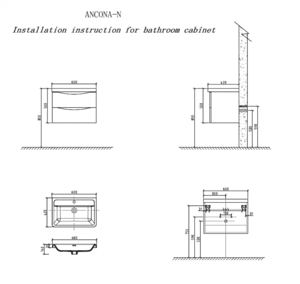 База под раковину подвесная с двумя выкатными ящиками, с доводчиками, 600x420x450 мм C врезной (фрезерованной) ручкой в плоскости фасада