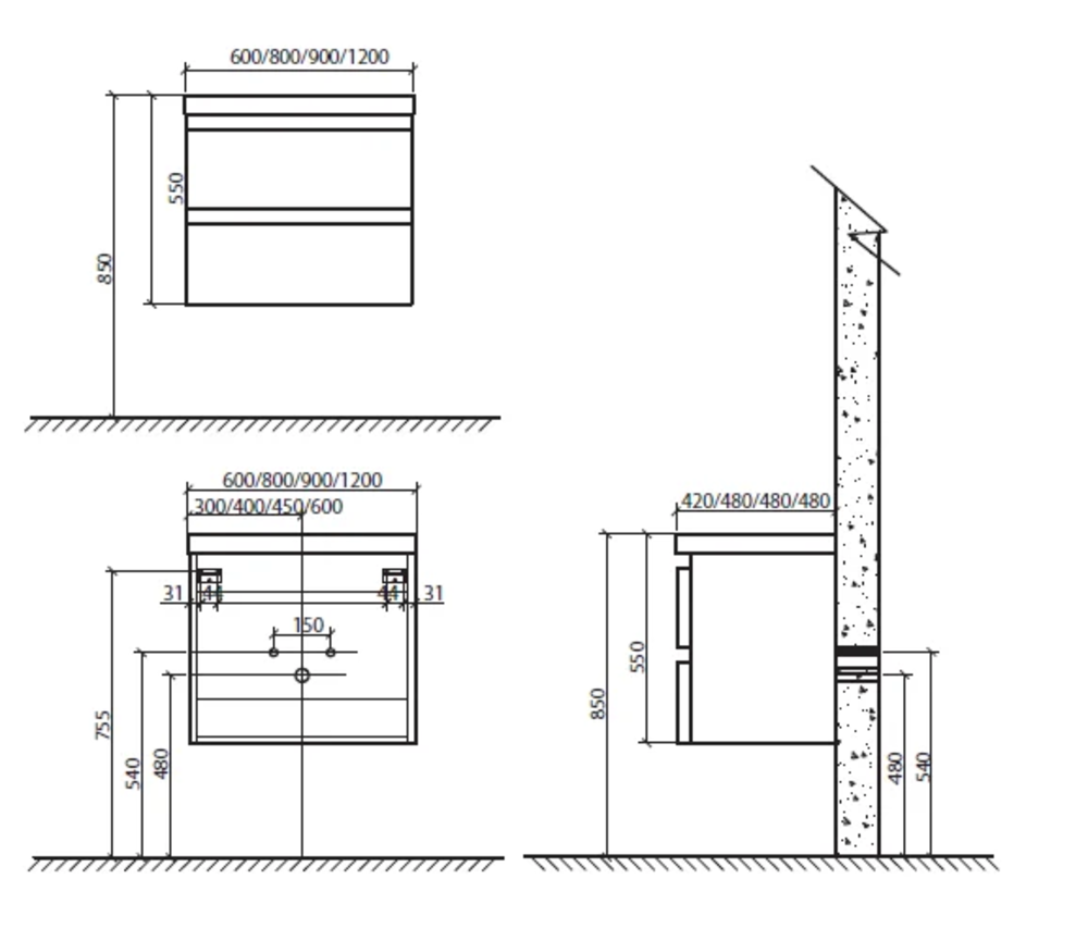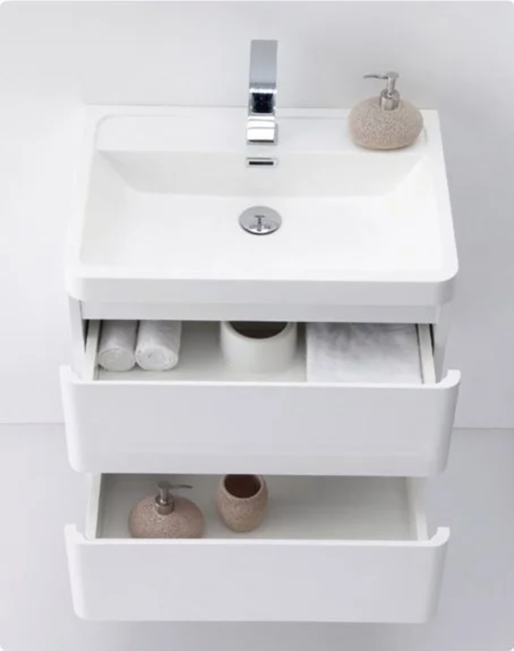 База под раковину подвесная с двумя выкатными ящиками, с доводчиками, 600x420x500 мм C врезной (фрезерованной) ручкой в плоскости фасада