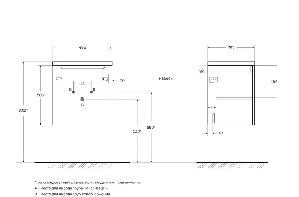 Тумба подвесная с одной распашной дверцей, с одной полкой. Корпус и фасад изготовлены из влагостойкого МДФ, покрытие пленка ПВХ. Одна распашная дверца, петли оснащены доводчиками, врезная фрезерованная ручка в плоскости фасада. Полка внутри. Раковина донным клапаном и сифоном не комплектуется и приобретаются отдельно.