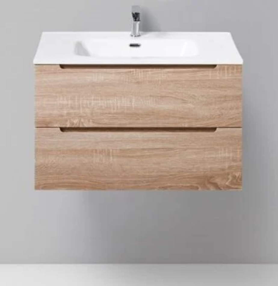 Тумба под раковину подвесная Размер: 80 x 45.5 x 50 см Ящики выдвижные: 2 С механизмом плавного закрывания Ручки скрыты в плоскости фасада Материал: МДФ Покрытие: пленка Форма: прямоугольная Цвет: белый дуб (rovere bianco)