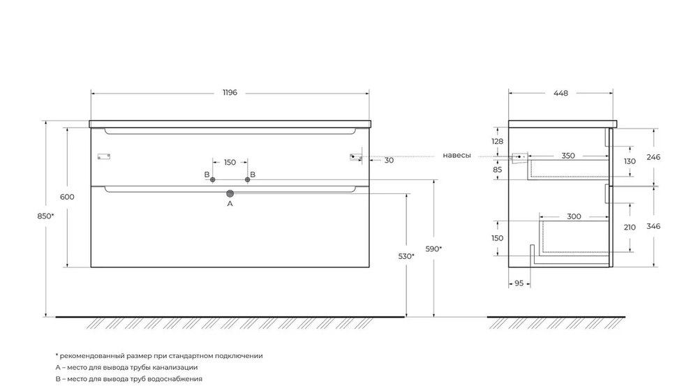 Увеличенная глубина нижнего ящика, большая вместимость по сравнению с базами стандартных размеров.