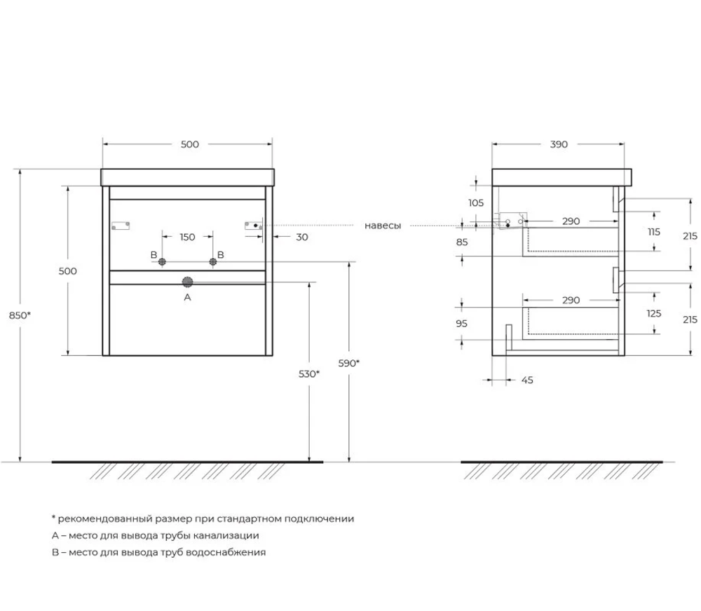 Тумба подвесная с двумя выкатными ящиками и керамической раковиной. Два выдвижных ящика с фрезерованными ручками по всей длине фасада. Ящики оснащены доводчиками скрытого монтажа с системой Soft close (плавного закрывания).