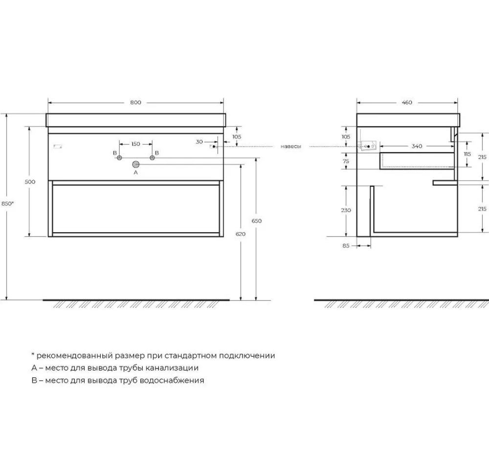 Тумба подвесная с возможностью комплектации керамической раковиной. Один ящик с фрезерованными ручками по всей длине фасада, одна открытая полка. Ящик оснащён доводчиками скрытого монтажа с системой Soft close (плавного закрывания).