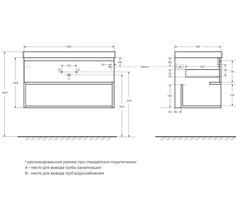 Тумба подвесная с возможностью комплектации керамической раковиной. Один ящик с фрезерованными ручками по всей длине фасада, одна открытая полка. Ящик оснащён доводчиками скрытого монтажа с системой Soft close (плавного закрывания).