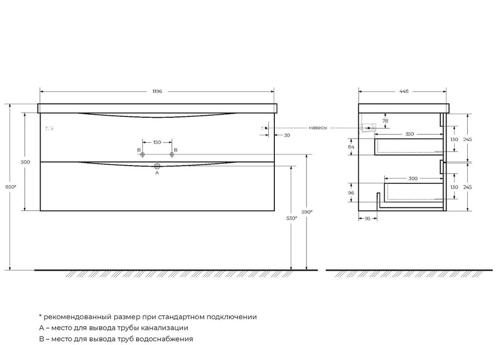 Тумба подвесная с двумя выкатными ящиками для дополнительной комплектации раковиной. Два выдвижных ящика с фрезерованными ручками в плоскости фасада. Ящики оснащены доводчиками скрытого монтажа с системой Soft close (плавного закрывания).
