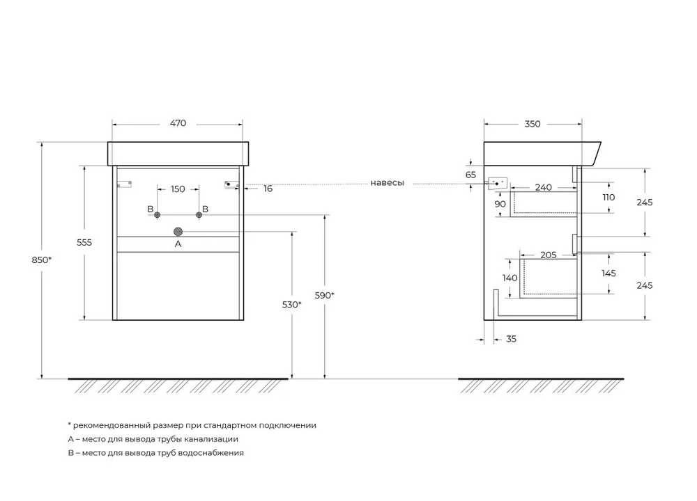 Тумба подвесная с двумя выкатными ящиками и керамической раковиной. Два выдвижных ящика с фрезерованными ручками по всей длине фасада. Ящики оснащены доводчиками скрытого монтажа с системой Soft close (плавного закрывания). Раковина приобретается отдельно.