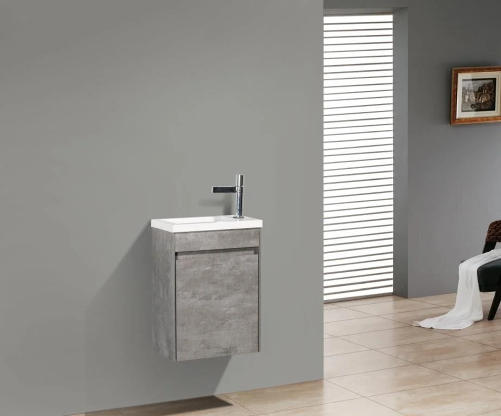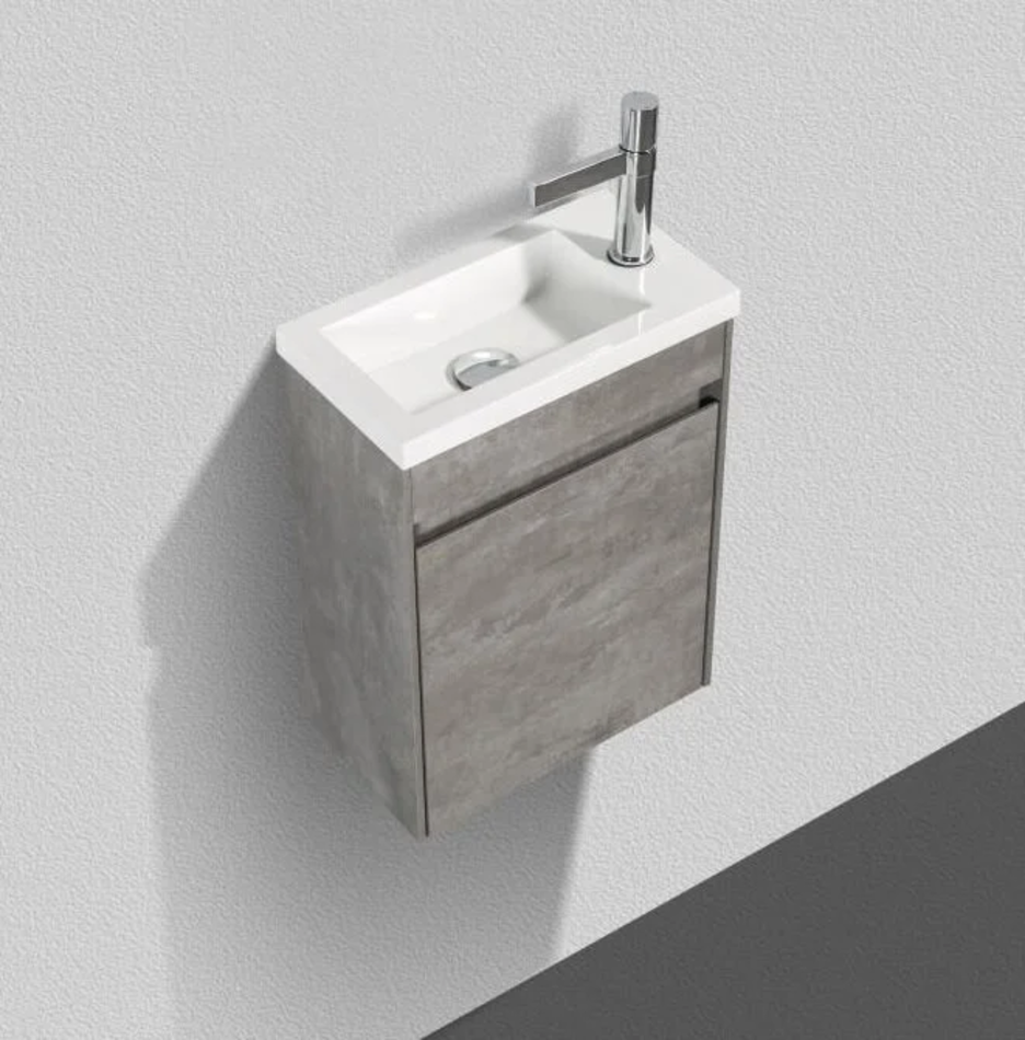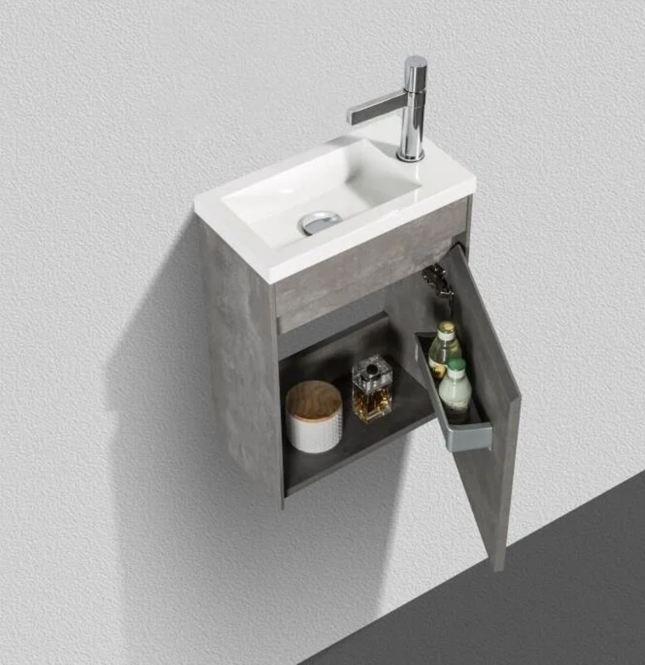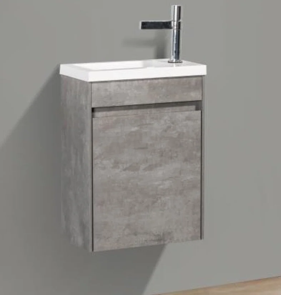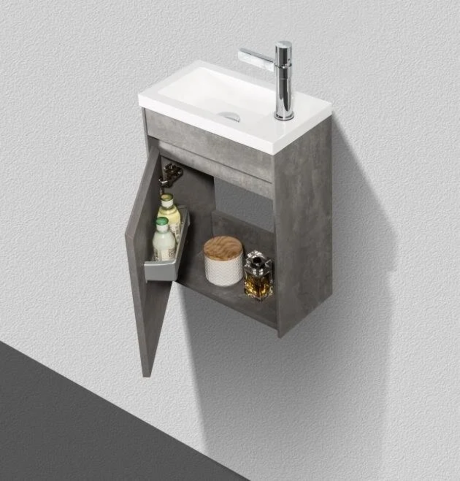 Тумба под раковину L/R Размер: 40 x 22 x 52 см Монтаж: подвесной Двери распашные: 1 Ориентация: петли слева/ петли справа Доводчики Форма: прямоугольная Материал: влагостойкий ДСП Цвет: серый (Stucco Cemento)