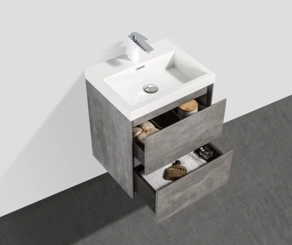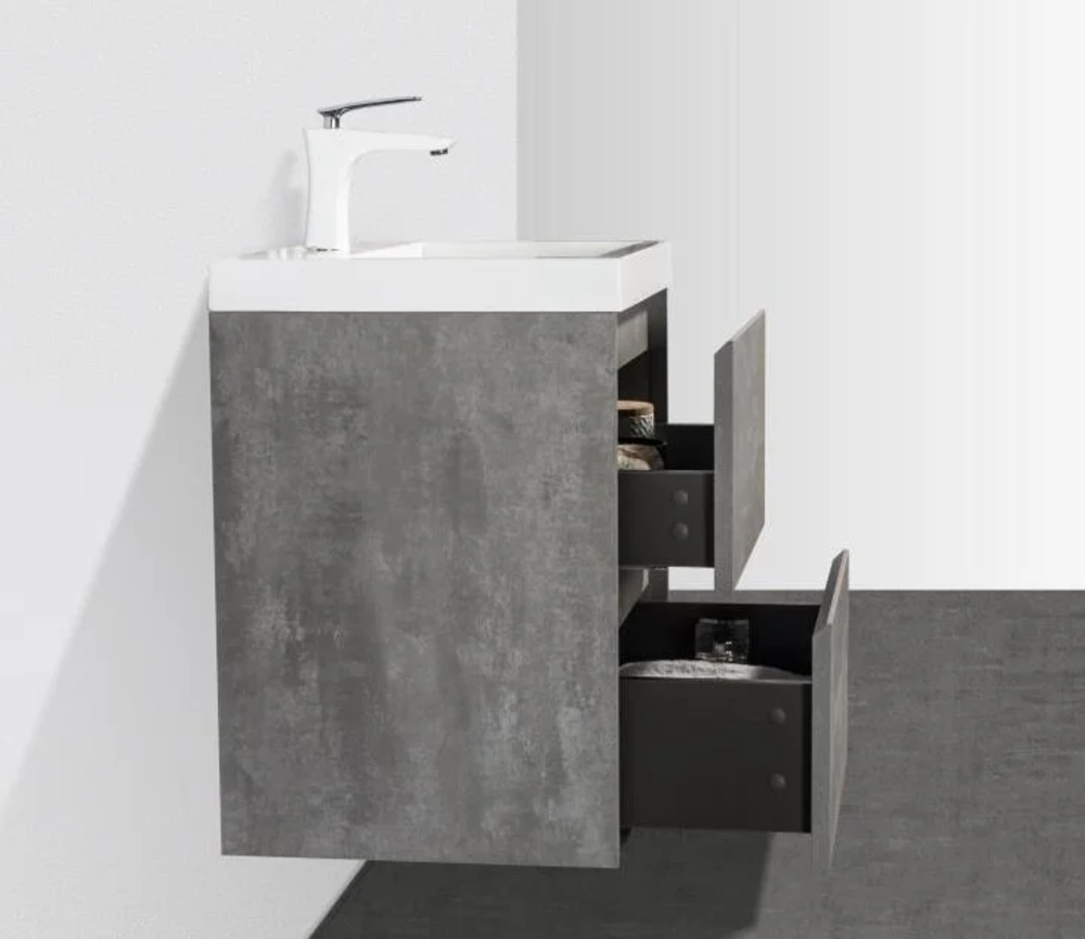 Тумба под раковину Размер: 50 x 40 x 61.5 см Монтаж: подвесной Ящики выдвижные: 2 Доводчики Форма: прямоугольная Материал: влагостойкий ДСП Цвет: серый (Stucco Cemento)