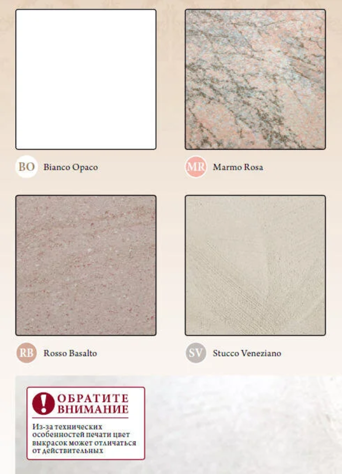 Доступные отделки фасада: Bianco Opaco, Marmo Rosa, Rosso Basalto, Stucco Veneziano
