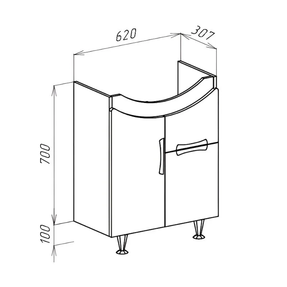 Тумба напольная ЛАГУНА 65, на ножках, с двумя распашными фасадами и одним выдвижным ящиком, внутреннее пространство разделено полочкой