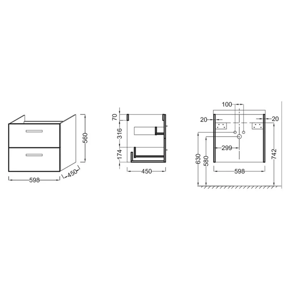 Тип: подвесной 2 выдвижных ящика Форма: прямоугольная Ширина: 59,8 см Глубина: 45 см Высота: 56 см Цвет: темный дуб