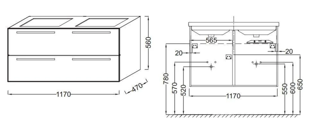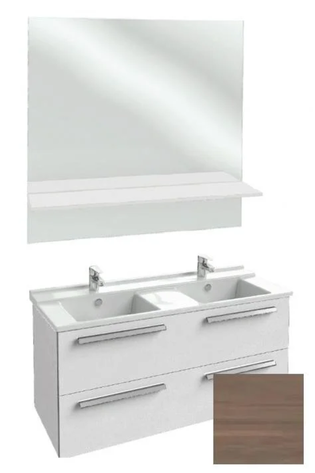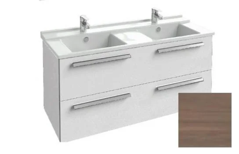 Тумба под раковину Размер (ШxГxВ): 117х47х56 см Монтаж: подвесной Ящики выдвижные: 2 С механизмом плавного закрывания Форма: прямоугольная Материал: МДФ, ЛДСП Покрытие: меламин Цвет: ореховое дерево (E16)