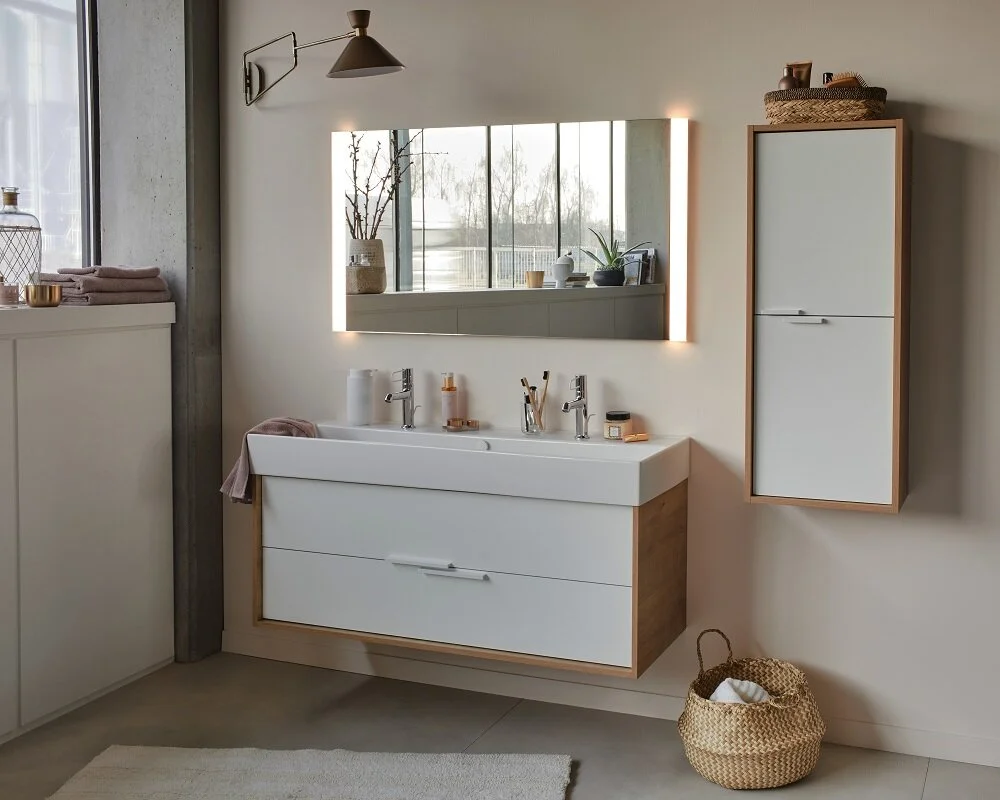 Тумба под раковину Jacob Delafon Vivienne 120 см, корпус дуб табак, фасад белый матовый, без ручек, EB1586-E52-M49