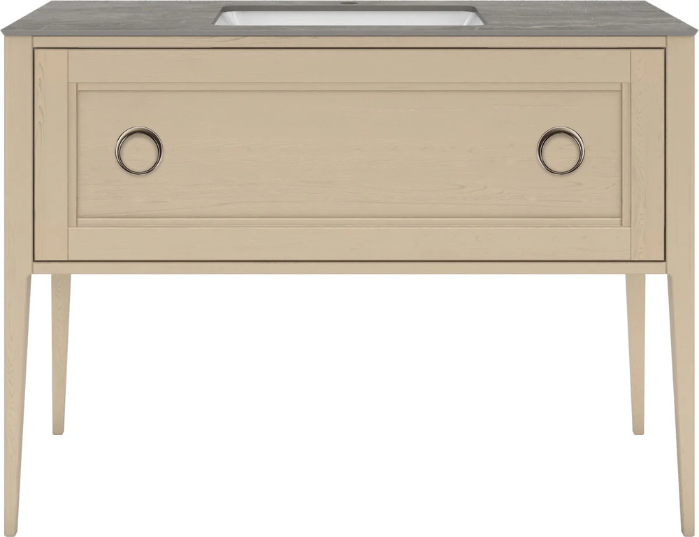 Напольная тумба с одним выдвижным ящиком выполнена из массива ясеня с отделкой «открытая пора». Вместительный ящик с плавным закрыванием украшен двумя крупными ручками. Сочетается с керамическими столешницами PLAZA Classic шириной 120 см. Подходит для установки раковин с типом монтажа «встраиваемая снизу».