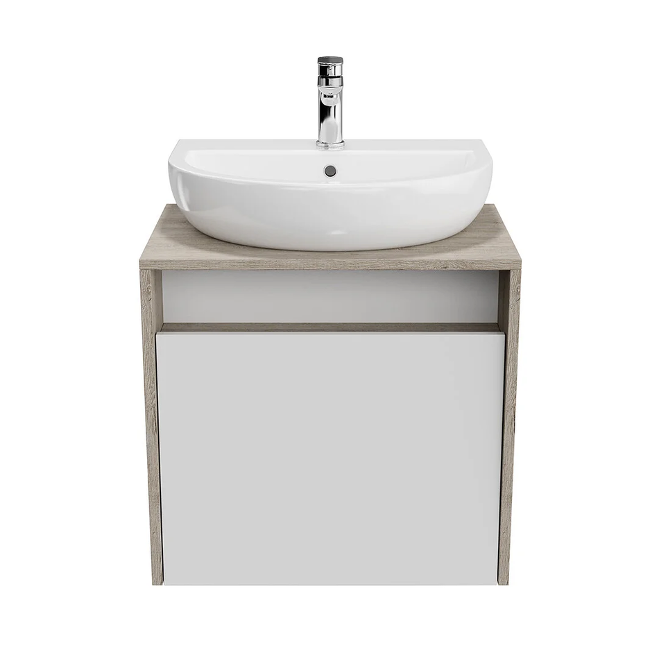 Корпус и столешница выполнены в цвете «дуб Орегон». Оригинальная форма тумбы: корпус немного расширяется от низа к верхней части. Предусмотрен один ящик с фасадом в белом глянцевом цвете, над ним — открытая полка. Подходит для подвесных раковин BUONGIORNO 55 см и PLAZA 55 см.