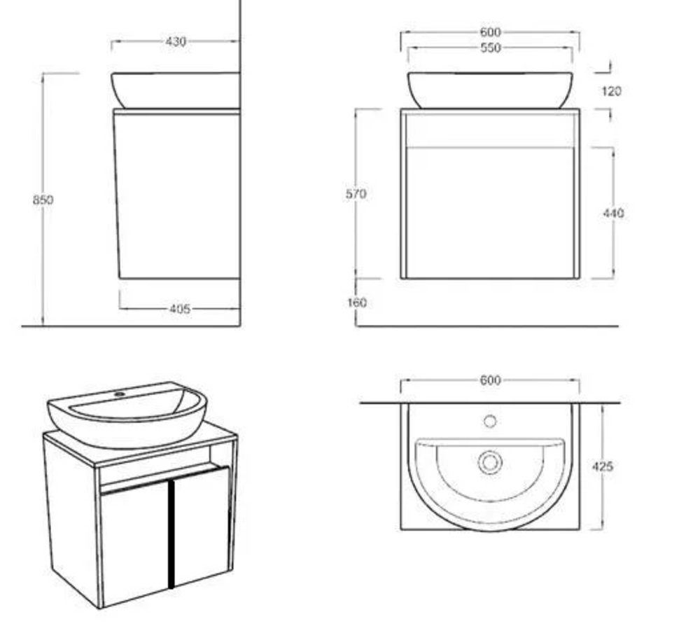 Корпус и столешница выполнены в цвете «дуб Орегон». Оригинальная форма тумбы: корпус немного расширяется от низа к верхней части. Распашной фасад с двумя дверцами, окрашенными в белый глянцевый, над ними — открытая полка. Подходит для подвесных раковин BUONGIORNO 55 см и PLAZA 55 см.