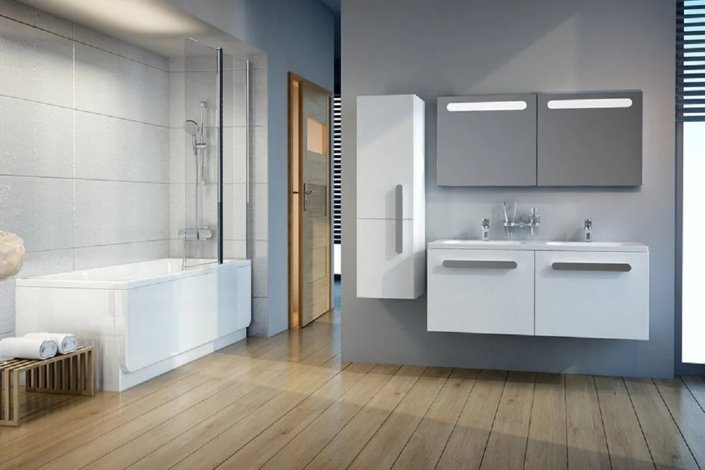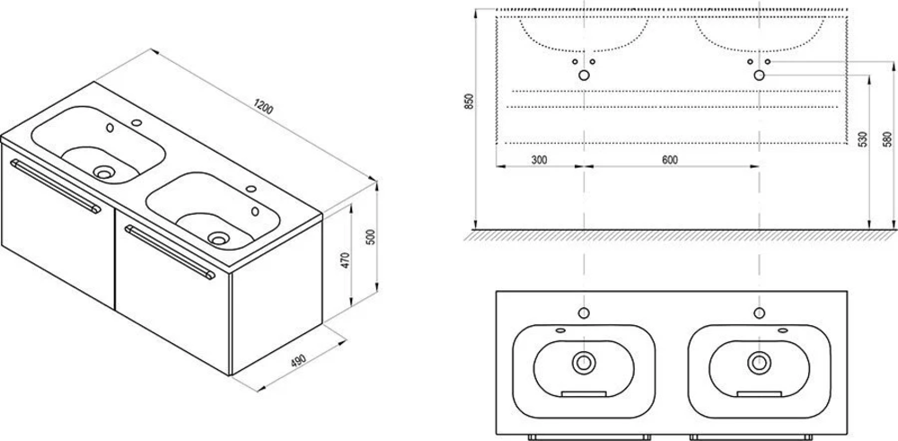 Практичная конструкция внутреннего пространства шкафчика позволяет сохранять порядок среди вещей. Двойным умывальником одновременно могут пользоваться два человека, а шкафчик без проблем может поместить в себе всю необходимую косметику и принадлежности для ванной комнаты. Шкафчик оборудован двумя высокими ящиками (40 см).
