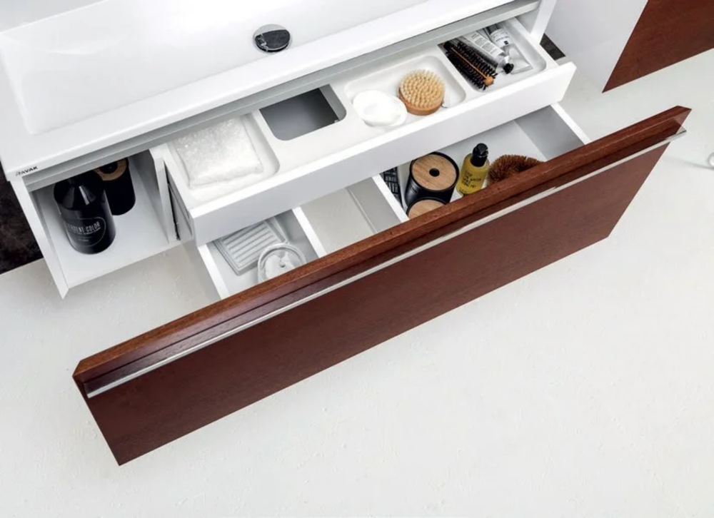 Элитный дизайн мебели подчеркивает фактурная поверхность. Точные грани дверец со скосом 45° представляют на рынке исключительно чистое решение для ванных комнат.