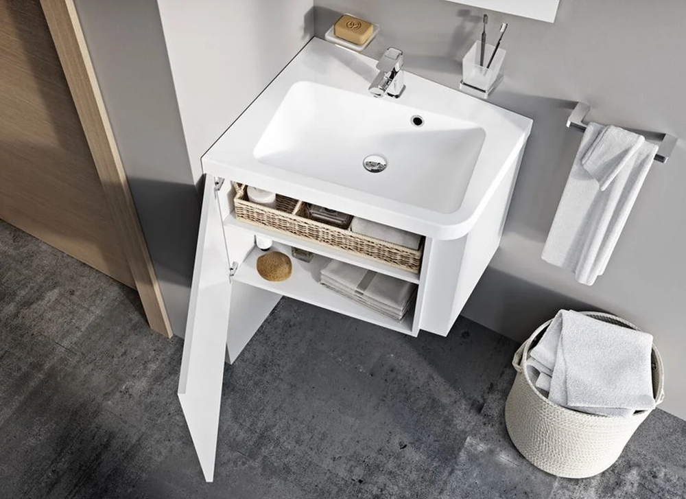 Шкафчик под умывальник SD 10° имеет ящик с пространством для вещей высотой 45 см. Поставляется в собранном виде.