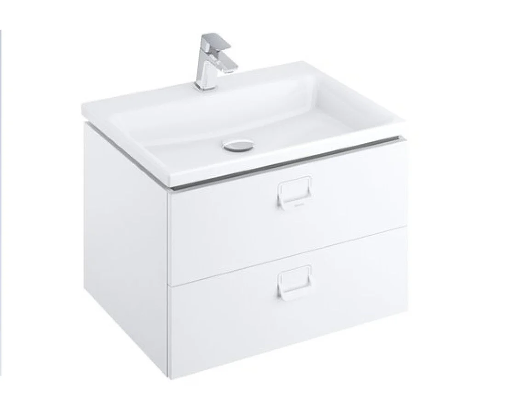 Очень просторная тумба с двумя выдвижными ящиками, оснащенных функцией медленного выдвижения, спрячет все, что используется в ванной комнате. Две металлических ручки обеспечивают удобство пользования ящиками и стандартно поставляются в белом цвете. Мы также предлагаем ручки в хромированном исполнении. Подвесную тумбу можно комбинировать с керамическим умывальником Comfort 800 и сифоном с фиксированным сливом для умывальников без перелива. Другое решение - это комбинация со столешницей Comfort 800 и умывальником для столешницы.