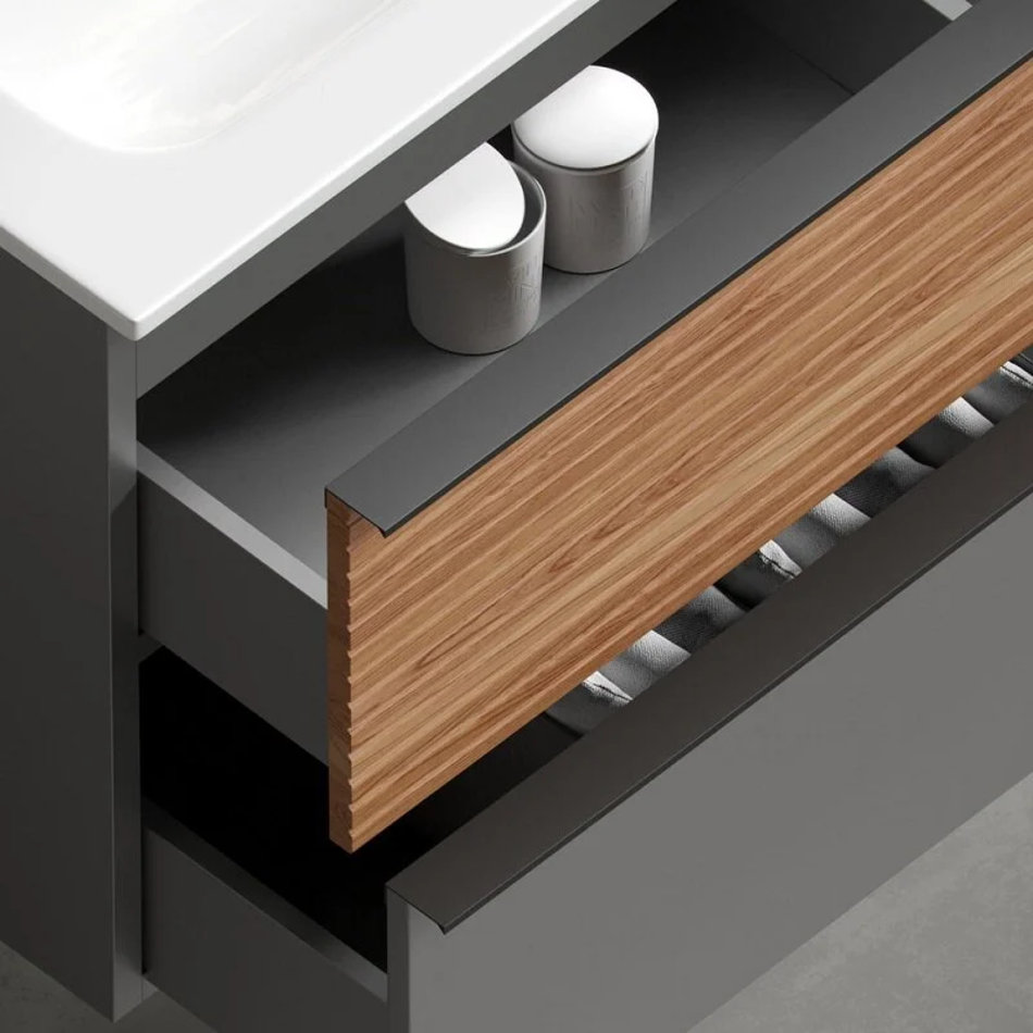 Тумба подвесная Sancos Delta 995х445х500, c двумя ящиками оснащенными доводчиками скрытого монтажа с системой Soft close (плавного закрывания), ручки чёрные профильные накладные, дуб красный/графит, артикул DL100GR