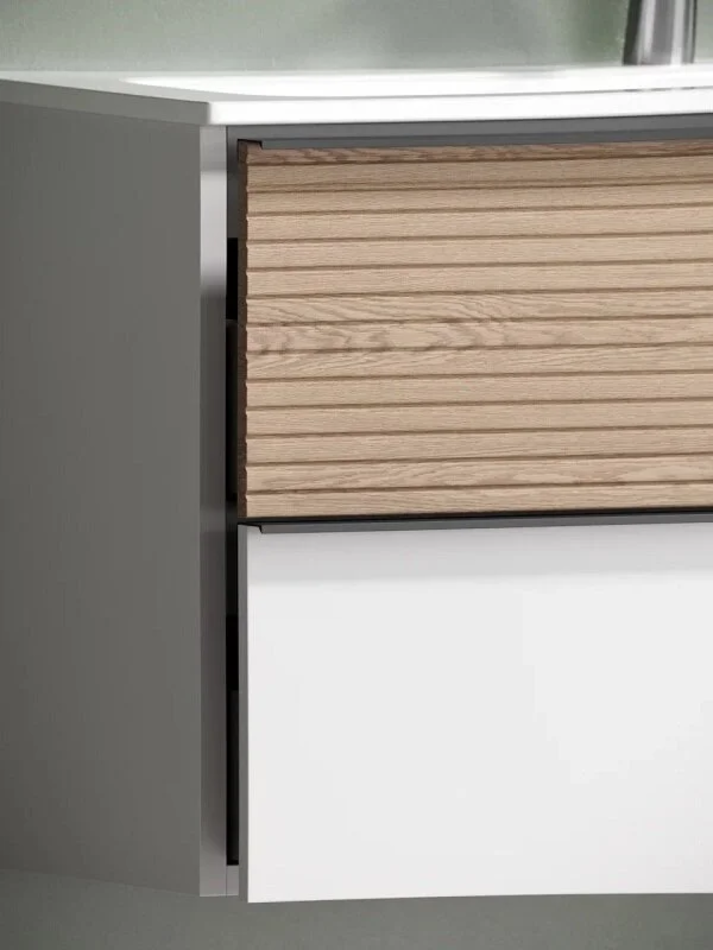 Тумба подвесная Sancos Delta 995х445х500, c двумя ящиками оснащенными доводчиками скрытого монтажа с системой Soft close (плавного закрывания), ручки чёрные профильные накладные, дуб светлый/белый матовый, артикул DL100W