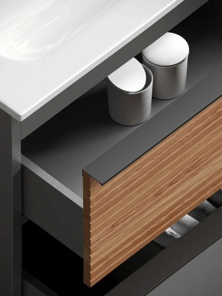 Тумба подвесная Sancos Delta 995х445х500, c двумя ящиками оснащенными доводчиками скрытого монтажа с системой Soft close (плавного закрывания), ручки чёрные профильные накладные , правая, дуб красный/графит, арт. DL100RGR