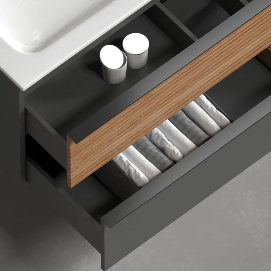Тумба подвесная Sancos Delta 1195х445х500, c двумя ящиками оснащенными доводчиками скрытого монтажа с системой Soft close (плавного закрывания), ручки чёрные профильные накладные, дуб красный/графит, артикул DL120GR