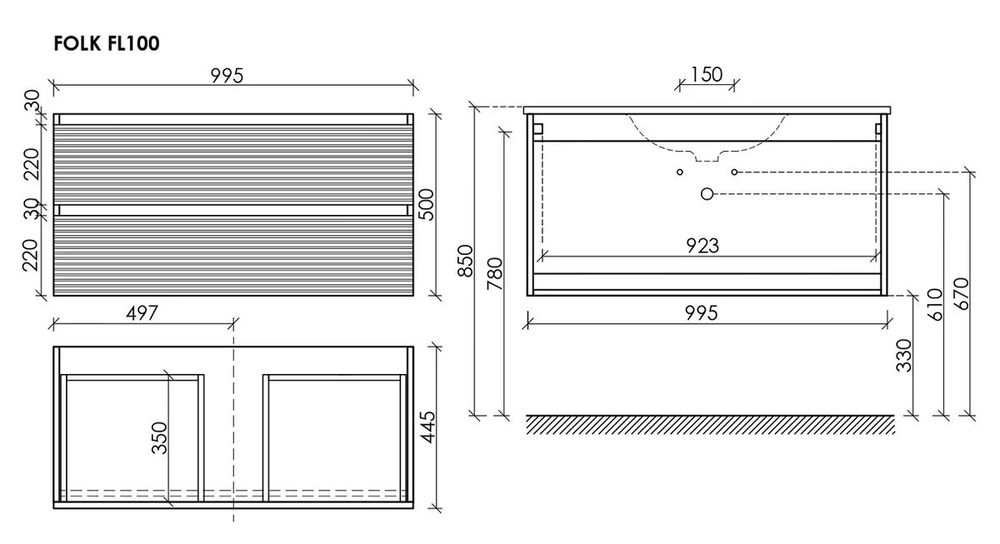 Тумба подвесная, с рельефным фасадом Sancos Folk (Ш:Г:В), 995х445х500 мм, c двумя ящиками, оснащенными доводчиками скрытого монтажа с системой плавного закрывания, цвет ergraut soft, арт. FL100ES