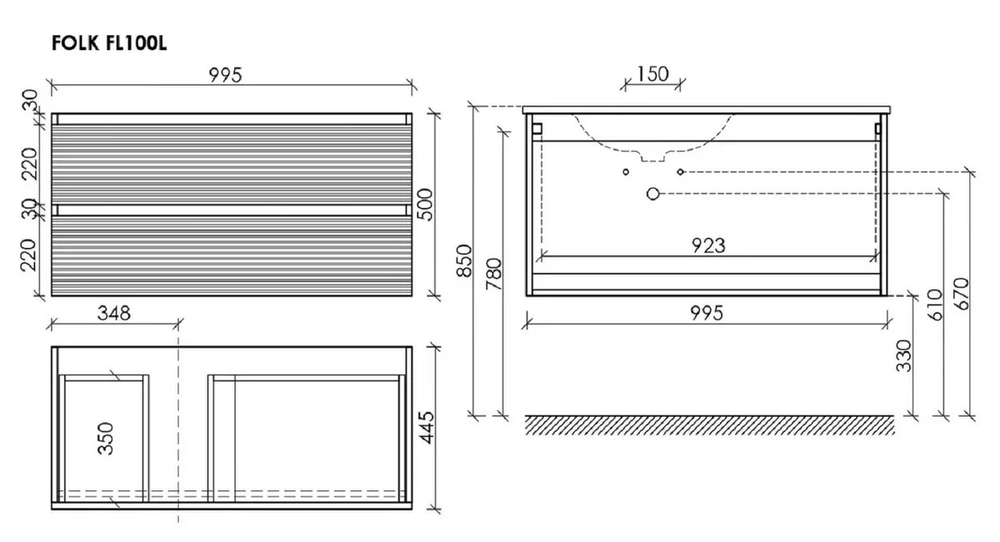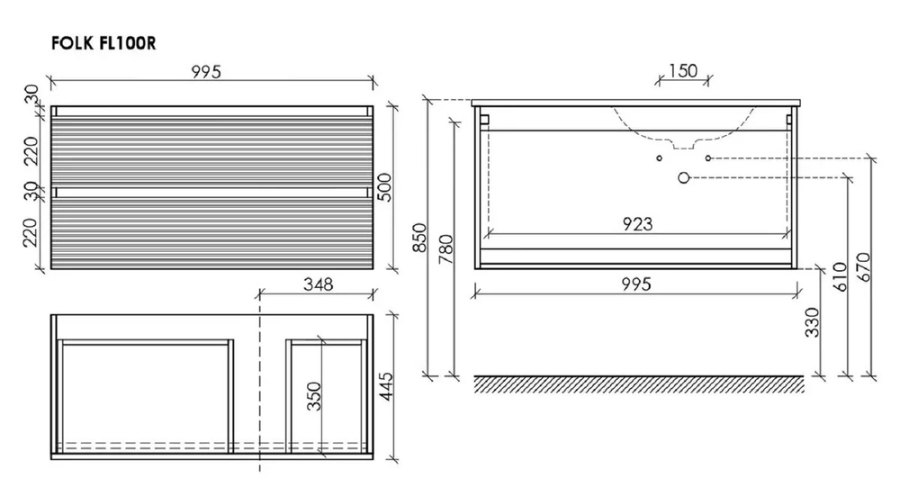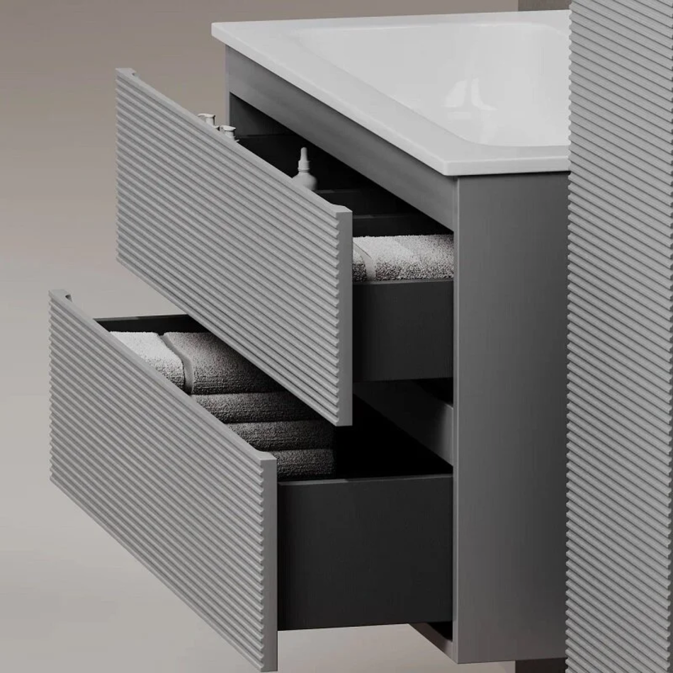Тумба подвесная с рельефным фасадом левая/правая, Sancos Folk FL100LW/FL100RW, (Ш:Г:В), мм: 995х445х500, c двумя ящиками оснащенными доводчиками скрытого монтажа с системой плавного закрывания, цвет ergraut soft