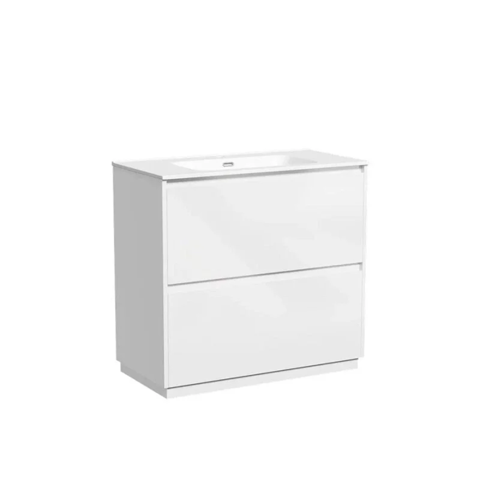 Тумба под раковину Sancos Libra Floor напольная, 890х450х840 c двумя ящиками, оснащенными доводчиками скрытого монтажа с системой Soft close (плавного закрывания), c фрезерованными ручками по всей длине фасада, белый глянцевый, арт. LB90FW