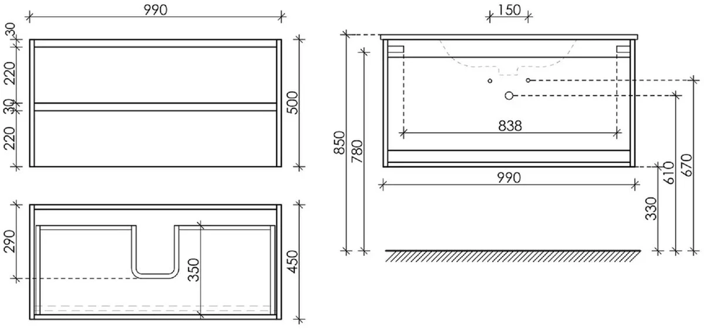 Тумба подвесная Sancos Libra 990х450х500 c двумя ящиками оснащенными доводчиками скрытого монтажа с системой Soft close (плавного закрывания), c фрезерованными ручками по всей длине фасада, дуб галифакс натуральный, LB100EG.