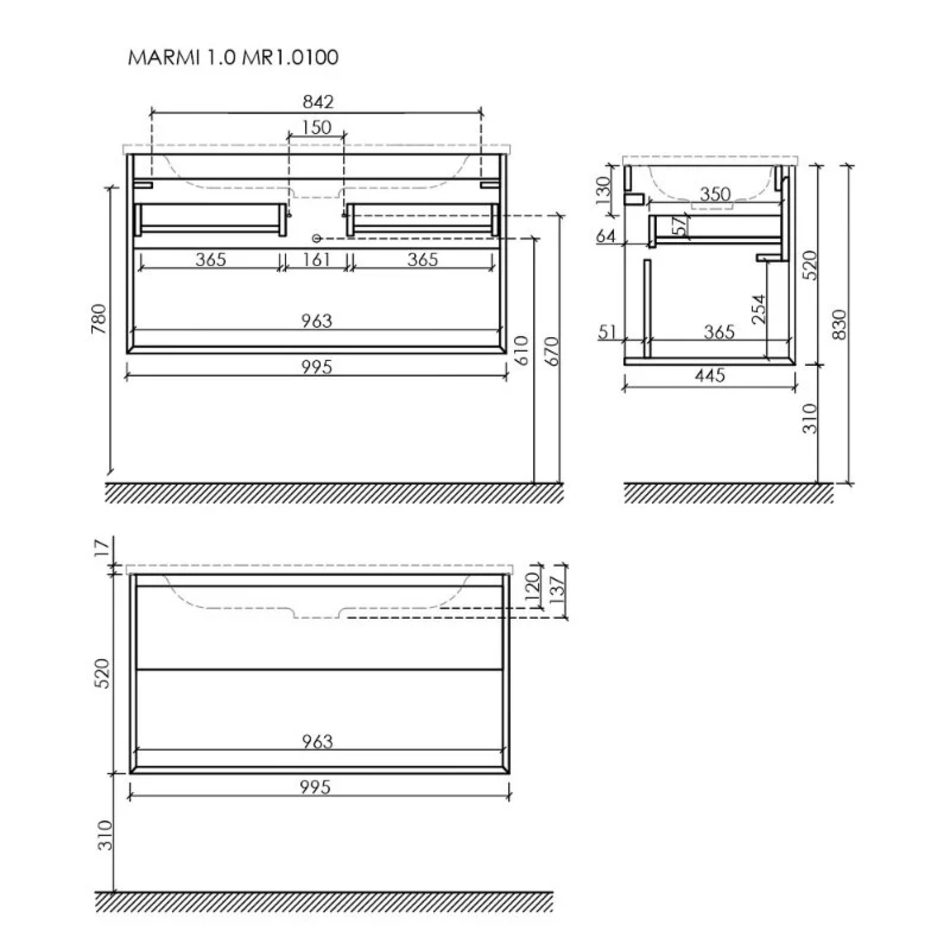 Тумба подвесная SANCOS Marmi 1.0 995х445х520 c одним ящиком оснащенным доводчиками скрытого монтажа с системой Soft close (плавного закрывания) и открытой нишей, c фрезерованной ручкой по всей длине фасада.