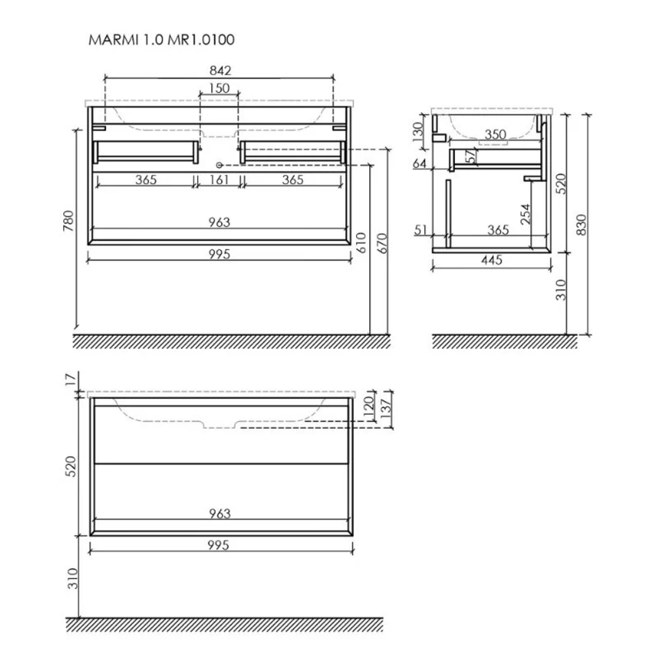 Тумба подвесная SANCOS Marmi 1.0 995х445х520 c одним ящиком оснащенным доводчиками скрытого монтажа с системой Soft close (плавного закрывания) и открытой нишей, c фрезерованной ручкой по всей длине фасада.