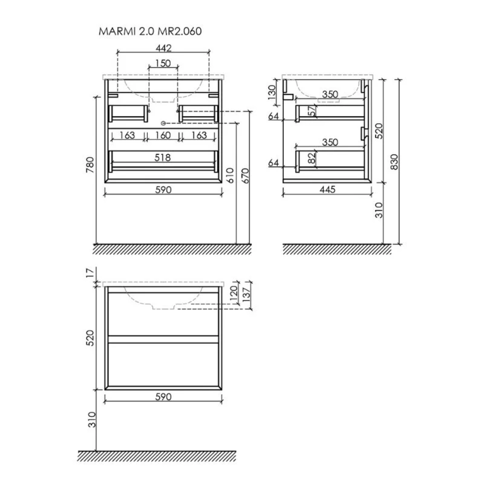 Тумба подвесная SANCOS Marmi 2.0 590х445х520 c двумя ящиками оснащенными доводчиками скрытого монтажа с системой Soft close (плавного закрывания), c фрезерованными ручками по всей длине фасада.