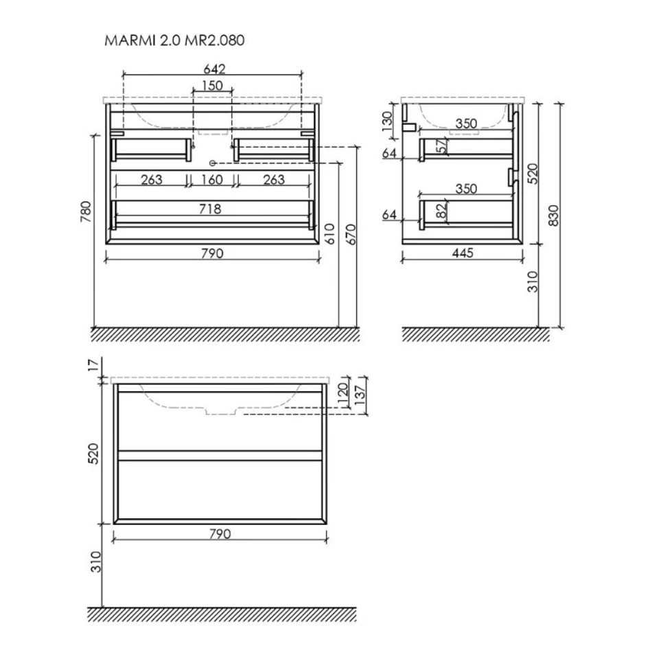 Тумба подвесная SANCOS Marmi 2.0 790х445х520 c двумя ящиками оснащенными доводчиками скрытого монтажа с системой Soft close (плавного закрывания), c фрезерованными ручками по всей длине фасада.