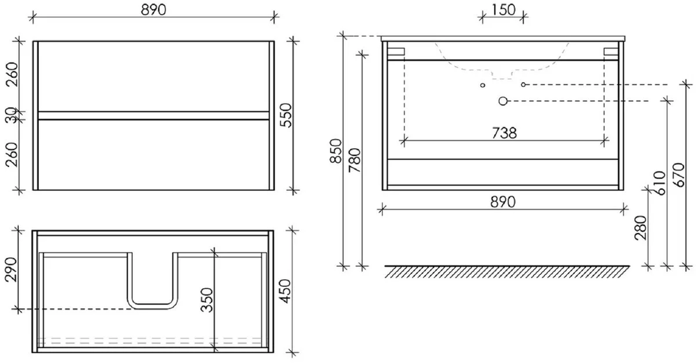 Тумба подвесная Sancos Urban 890х450х550 c двумя ящиками, оснащенными доводчиками скрытого монтажа с системой Soft close (плавного закрывания), c ручкой Gola по всей длине тумбы, дуб чарльстон, арт. UR90ECH