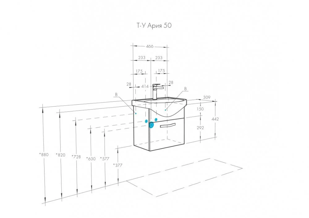Набор «Ария 50» состоит из подвесной тумбы, зеркала и подвесного шкафа-колонны. В тумбе за фасадом расположен ящик из влагостойкой ДСП со вставками, организующими его пространство.