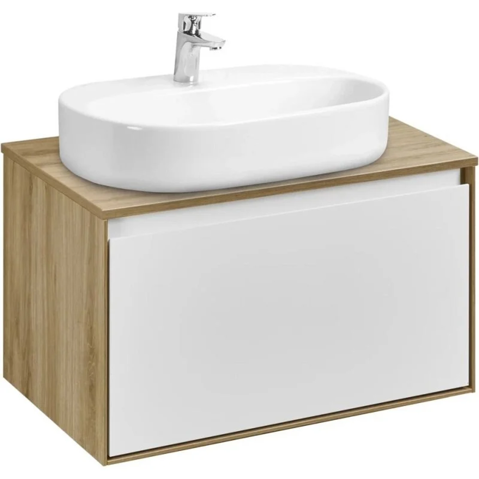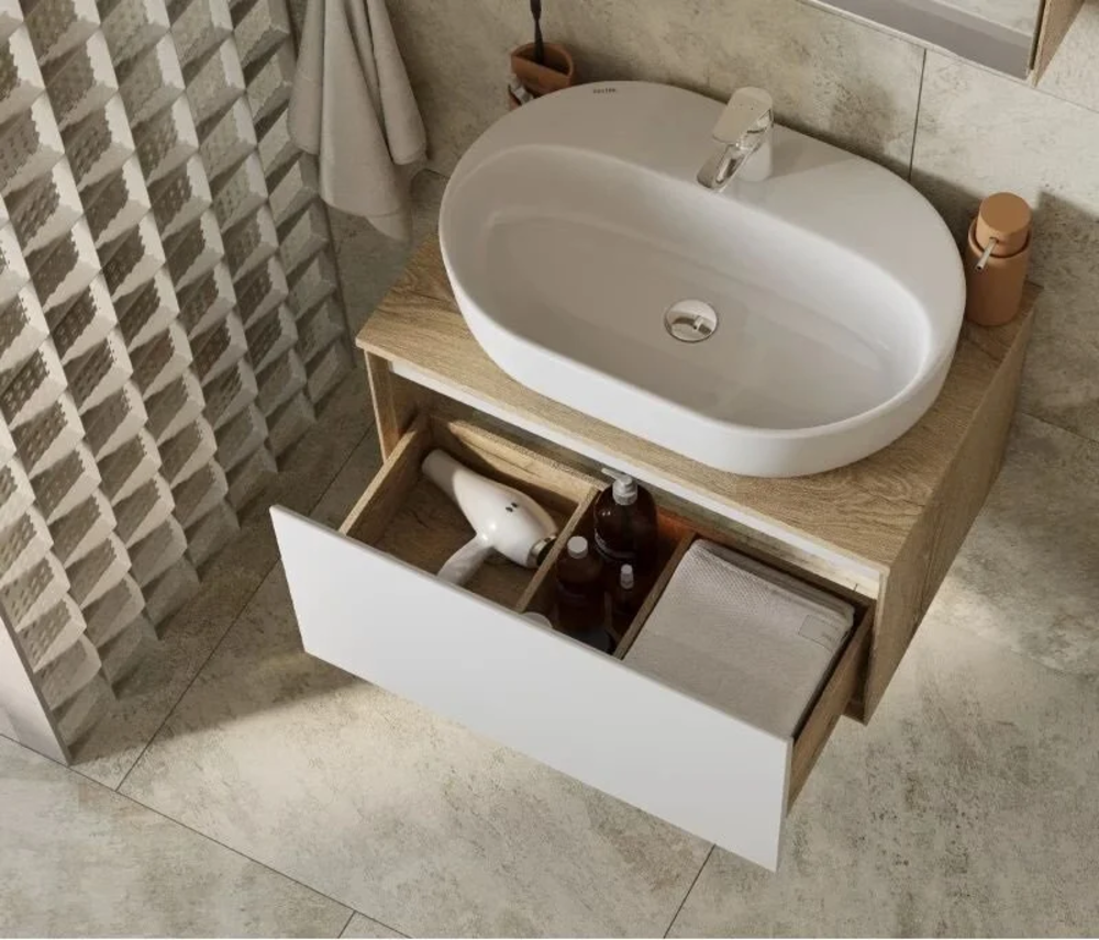 Тумба с раковиной Акватон Либерти 70 см, дуб эльвезия, белый, раковина накладная Одри Round 62 x 42, столешница дуб эльвезия, 1A2798К5LYC70