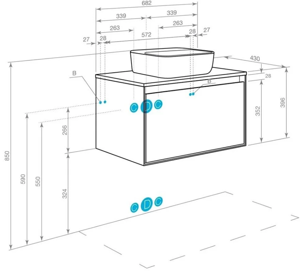 Размер без раковины: 68.2 x 43 x 39 см